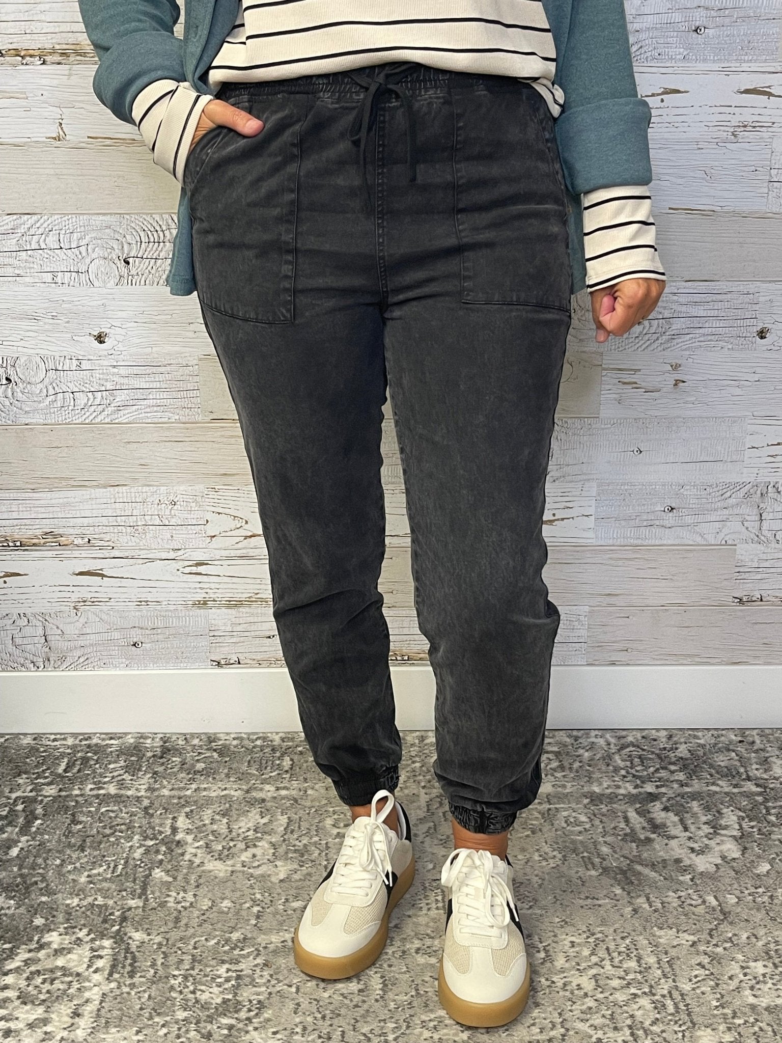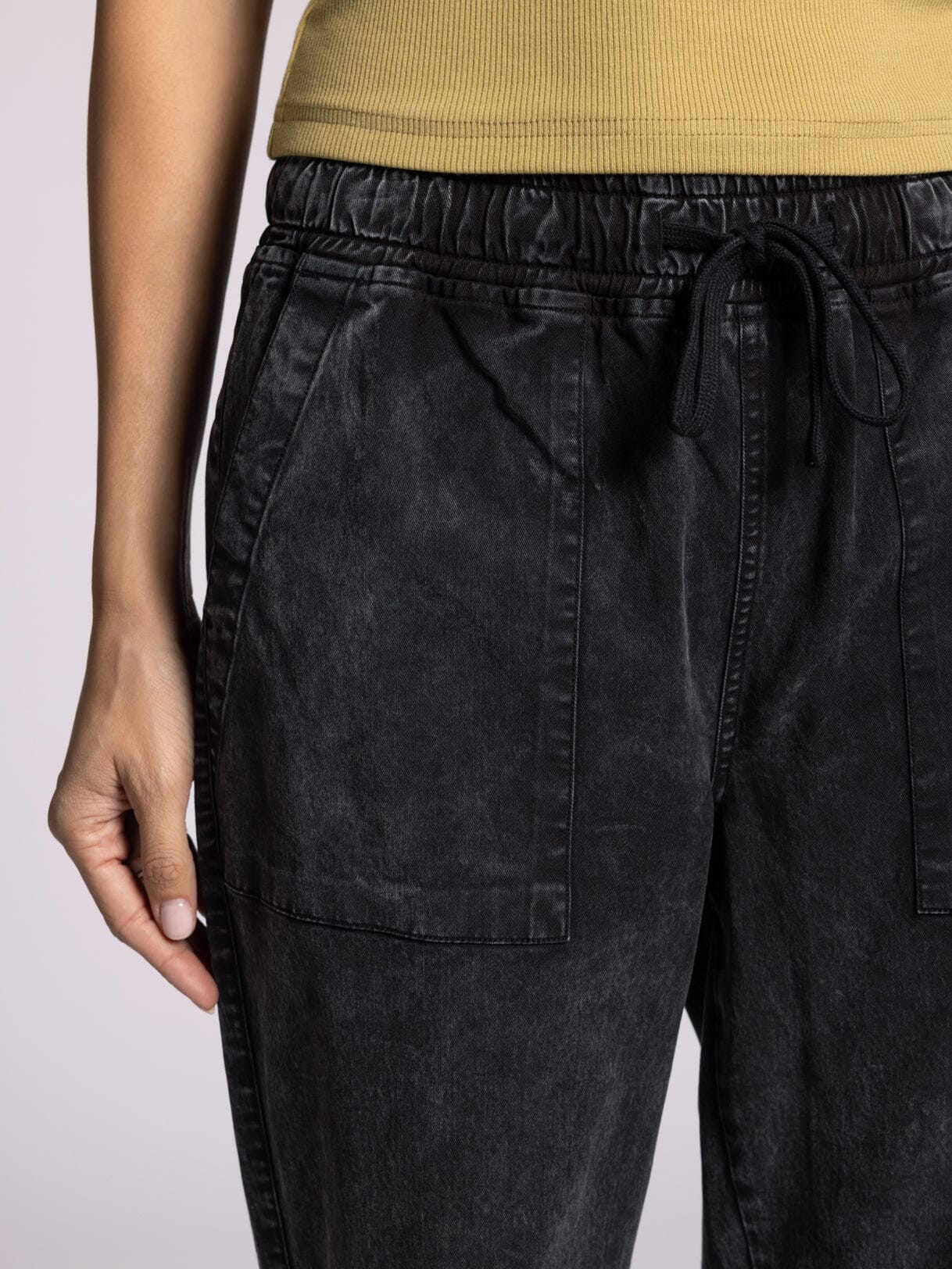 Experience effortless style and comfort with the Dylan Pants by Thread & Supply. These jogger bottom pants feature a soft elastic waistband and convenient side pockets, perfect for your casual days. The washed black color adds a trendy, lived-in look that pairs easily with any top. Whether you're lounging or out and about, these pants combine cute design with practical comfort.
