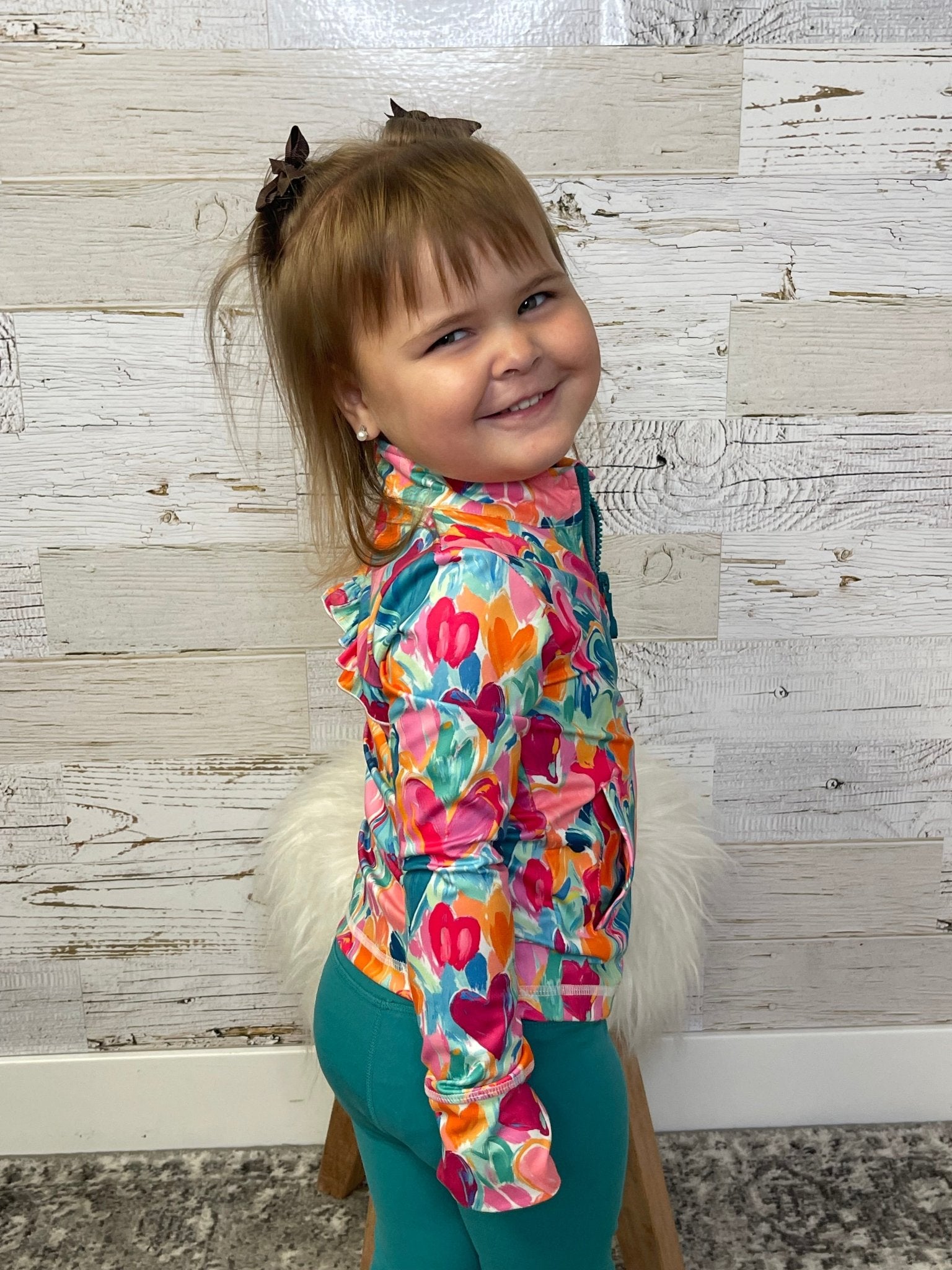 Get ready to conquer the day in the Heart Hustle Full-Zip Active Jacket! Designed for girls who love athleisure like Mommy, this jacket features a stylish ruffle detail and pairs perfectly with any of our active leggings. With great stretch, thumbholes, and pockets, it's the ultimate combination of fashion and function.