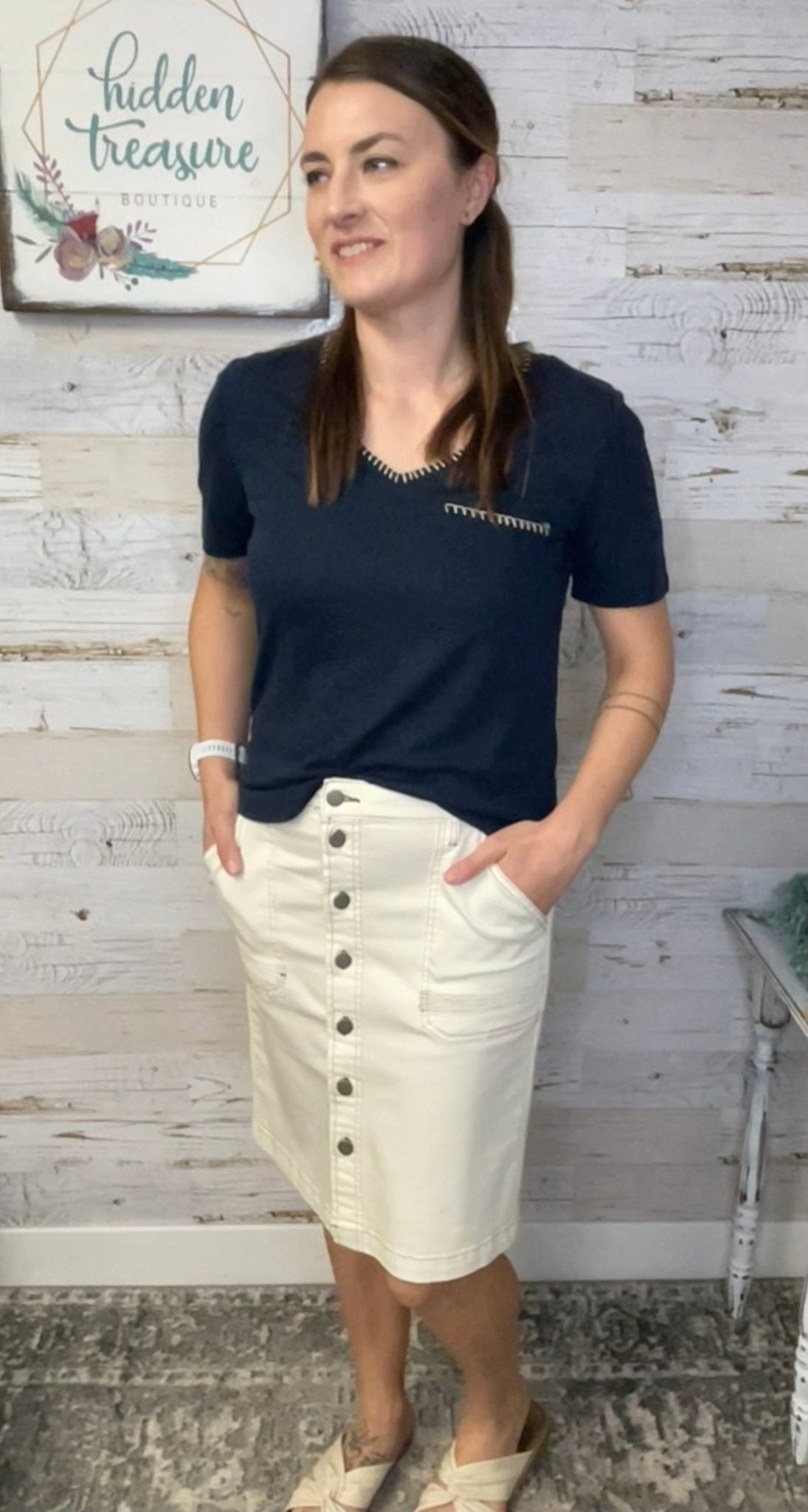 Elevate your wardrobe with the Isla Pencil Skirt by KUT denim! The cream color and contrast brown stitching create a versatile and sophisticated look. The button front and porkchop pocket add convenience and comfort stretch ensures a perfect fit. Upgrade your style and feel confident with every step!