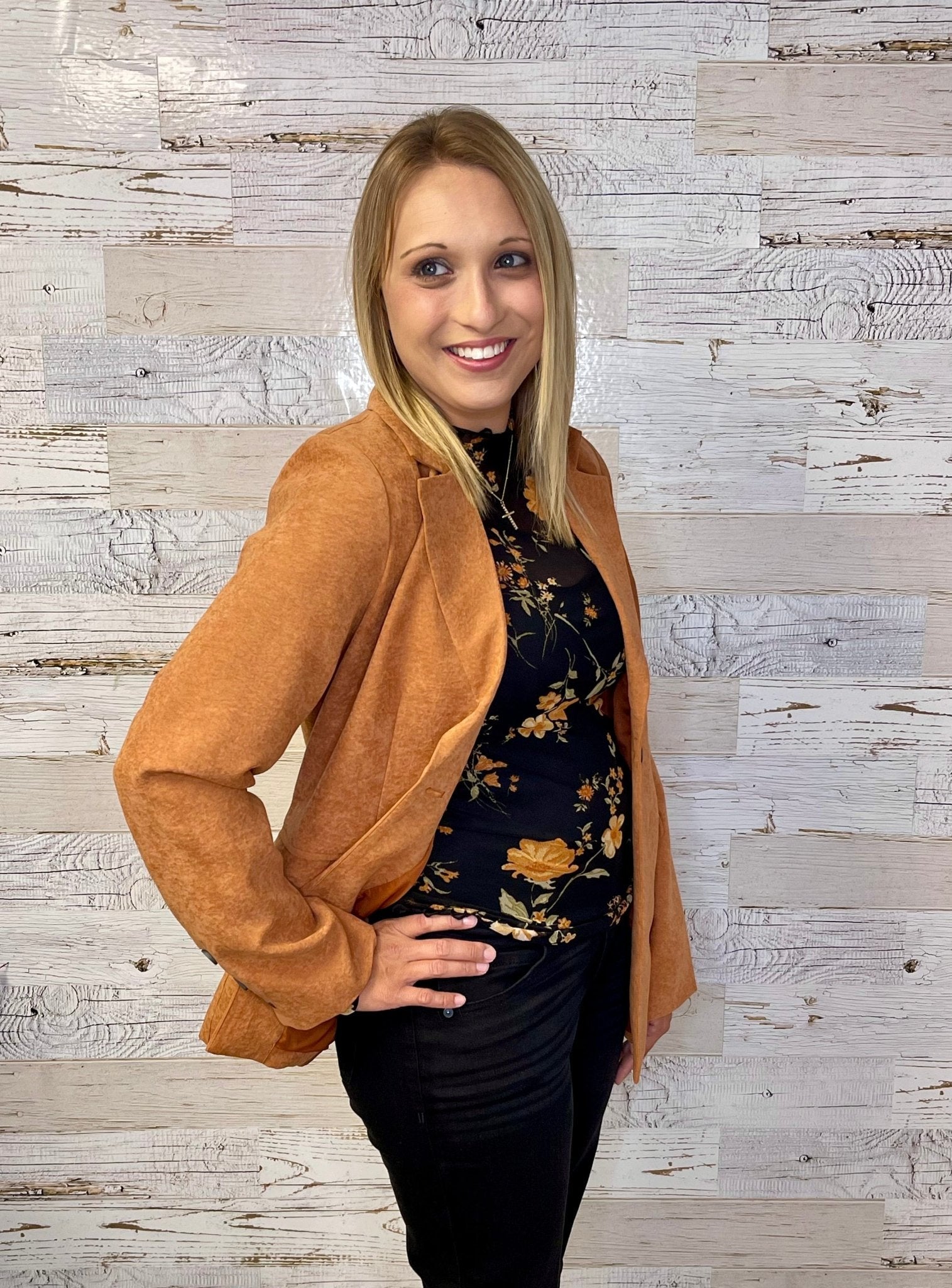The Sundown Pocket Blazer is a versatile addition to your wardrobe. Made from lightweight and comfortable fabric, it comes in a great fall rust color and features button details on the sleeves. With functioning front pockets, you have endless options on how to wear it. Perfect for any occasion.