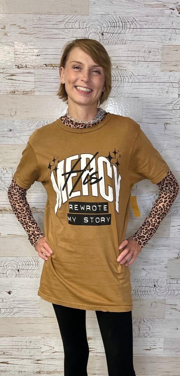 "Spread the message of grace and redemption with our His Mercy Tee. Made with a longer length and in a camel color, this tee serves as a reminder that it's only by His mercy that we are saved from our sins. Let your shirt do the talking and inspire others to embrace the power of His mercy."