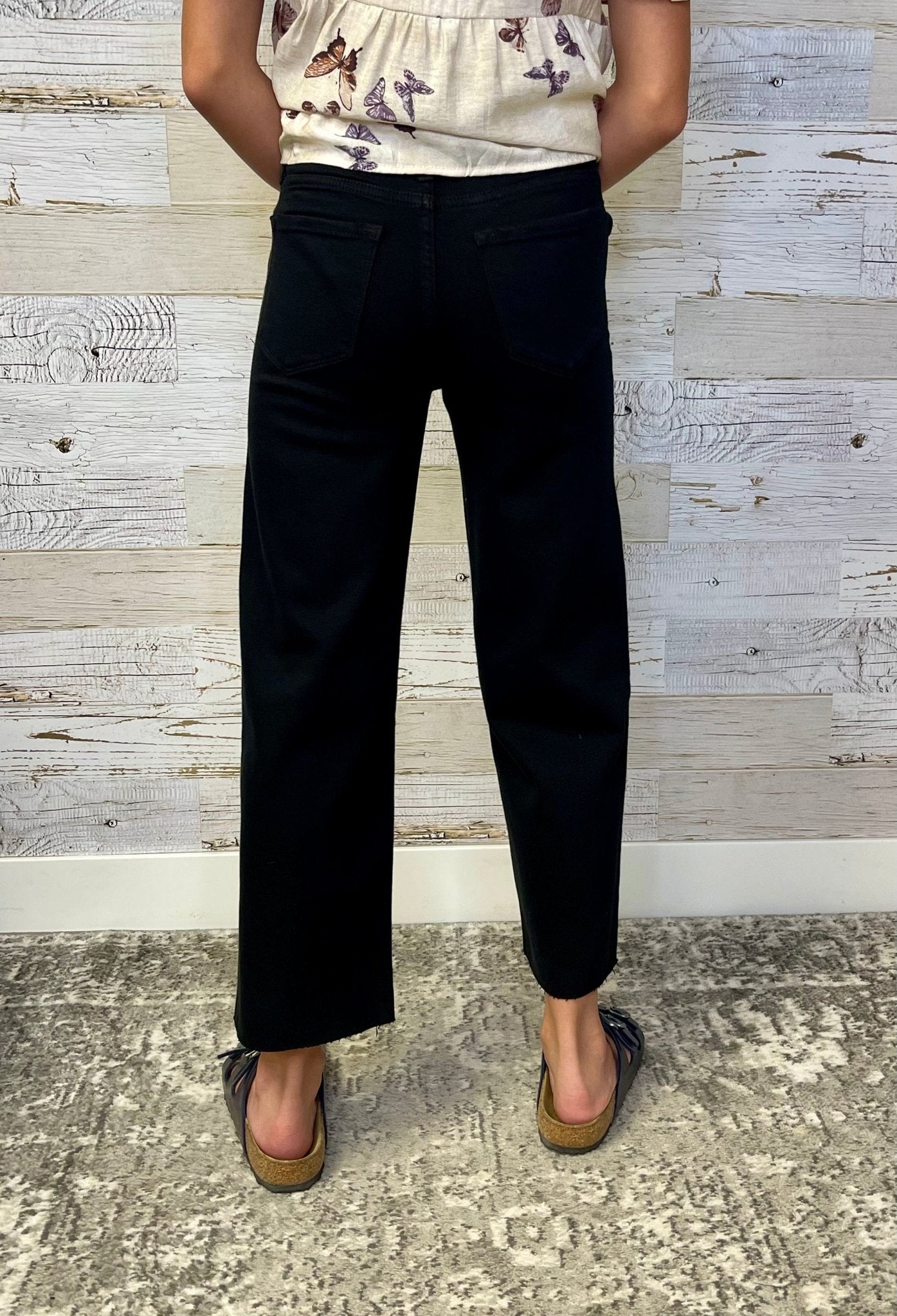 Get your daughter in on the latest trend with KanCan's black wide leg denim for girls. Made with stretch black denim, these jeans feature a raw hem that can be cropped or full length depending on their height. Perfect for the fashion-forward mini fashionista!
