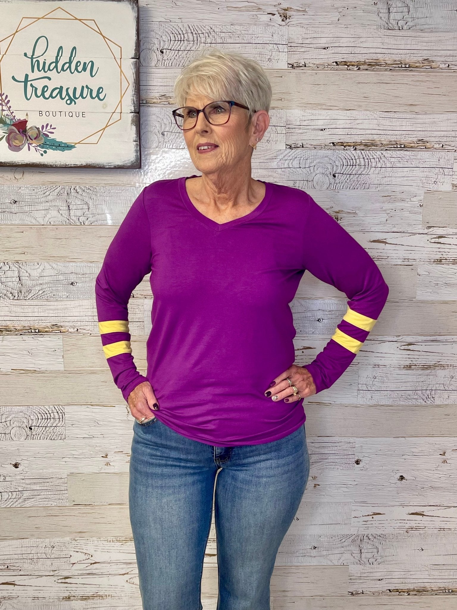 Score a touchdown in style with our GameDay Larissa Long Sleeve Top by Michelle Mae! This fan-favorite top will make you stand out in the crowd with your favorite Minnesota Vikings color combo. Perfect for showing off your team spirit! SKOL!!