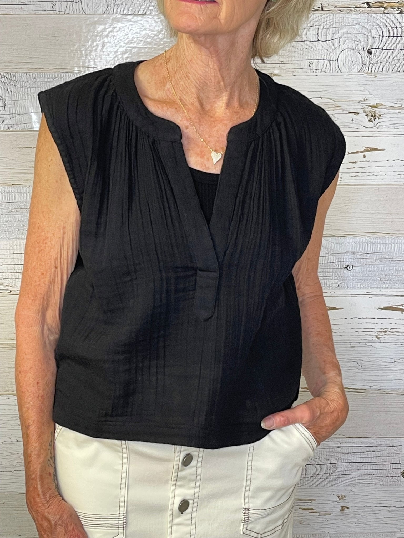 This sleeveless v-neck top by Z Supply is crafted from lightweight, 100% cotton gauze with soft shirring at the neckline for a touch of texture. With its breezy fit and airy feel, it's a warm-weather essential for everything from beach days to brunch.  We love it paired with Isla skirt by Kut.