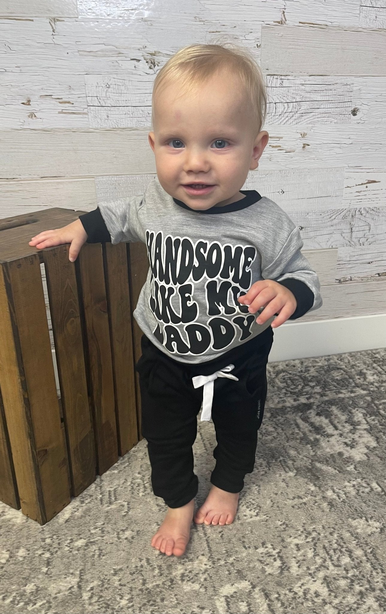 Get your little guy feeling cute and cozy in our Handsome Like Daddy pullover. With a playful graphic that lets him brag about his Dad, this pullover is sure to be a hit with both Dad and son. Perfect for any day of the week, because being handsome runs in the family.