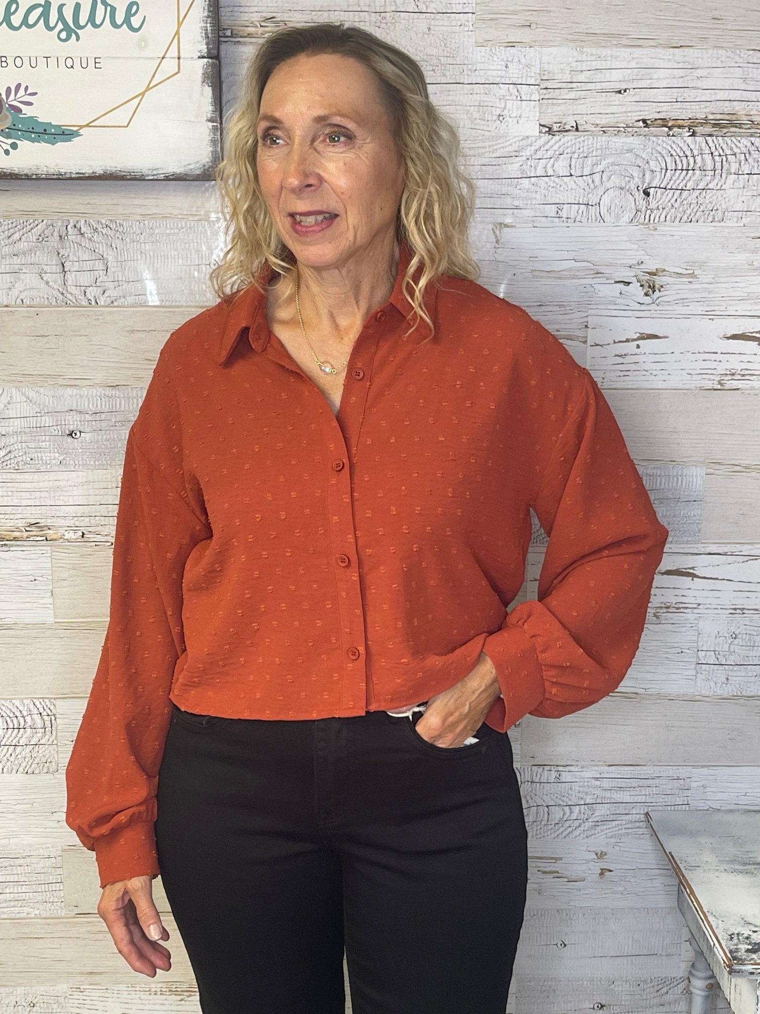 Indulge in the beauty of our Mary Button Down Top from Sadie & Sage. The bold Marsala color complements so many skin tones and is perfect for fall.  Don't be afraid of the shorter length because it goes great with a high waitsted pant.  We have it with black jeans but would also be great with some dark blue denim too!  The balloon sleeves and dotted fabric adds a touch of charm. Elevate your wardrobe with this beautiful and versatile top!