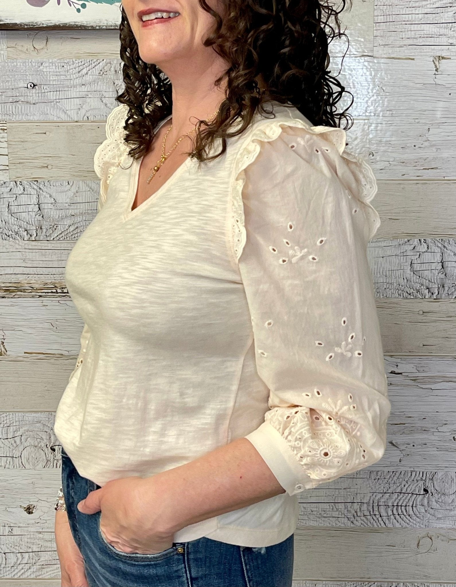 Shades of cream are having a real moment, and tops like this sophisticated mixed media knit style from Democracy make it easy to hop on the trend. Three quarter puff sleeves with crochet detail and ruffle shoulders steal the show, complemented by a rounded V-neck and a surplus shirttail hem, making it perfect on the job or for weekend plans.