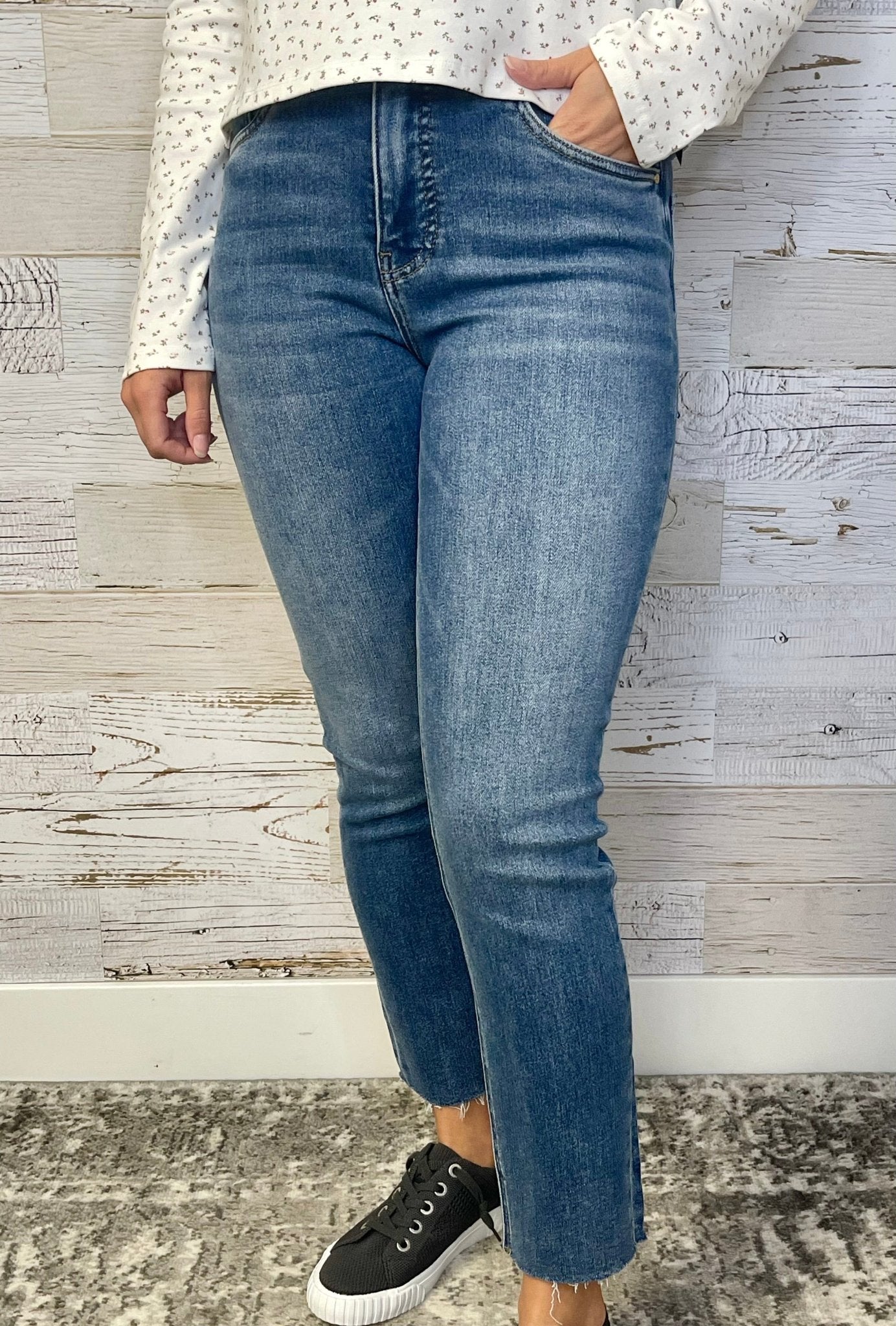 Experience the elevated comfort and style of Rachael High Rise Exalted Wash! With high rise and Kut denim, these jeans offer a clean and chic look. The medium blue wash adds versatility while the raw hem provides an edgy touch. Upgrade your wardrobe with these must-have jeans!