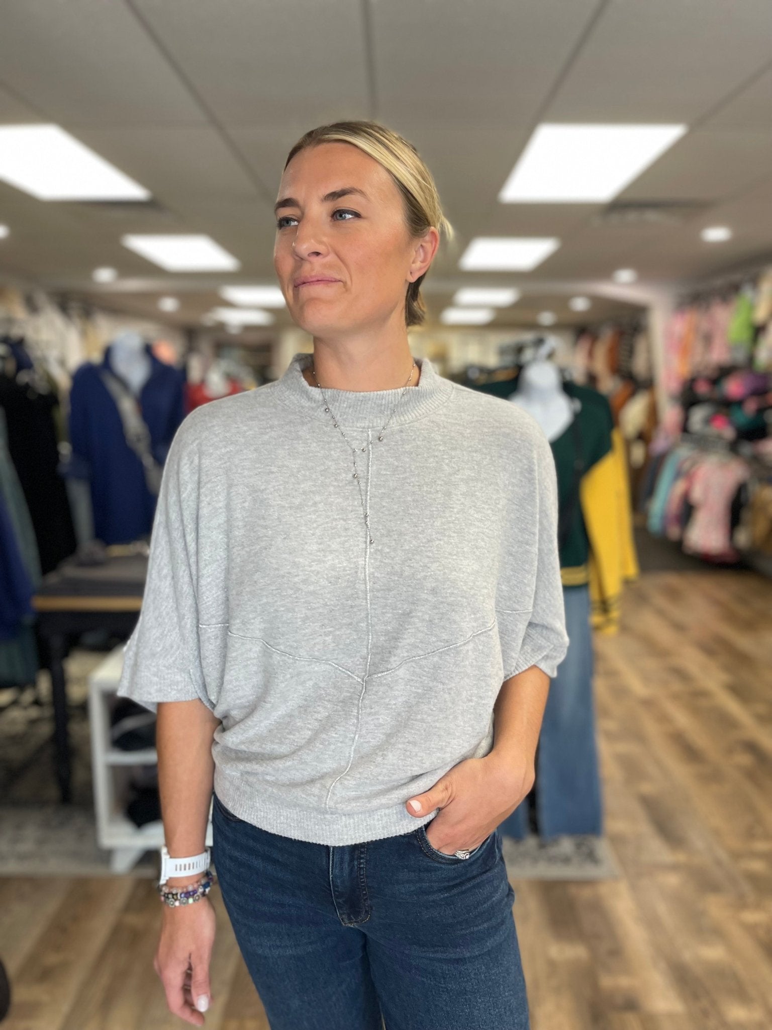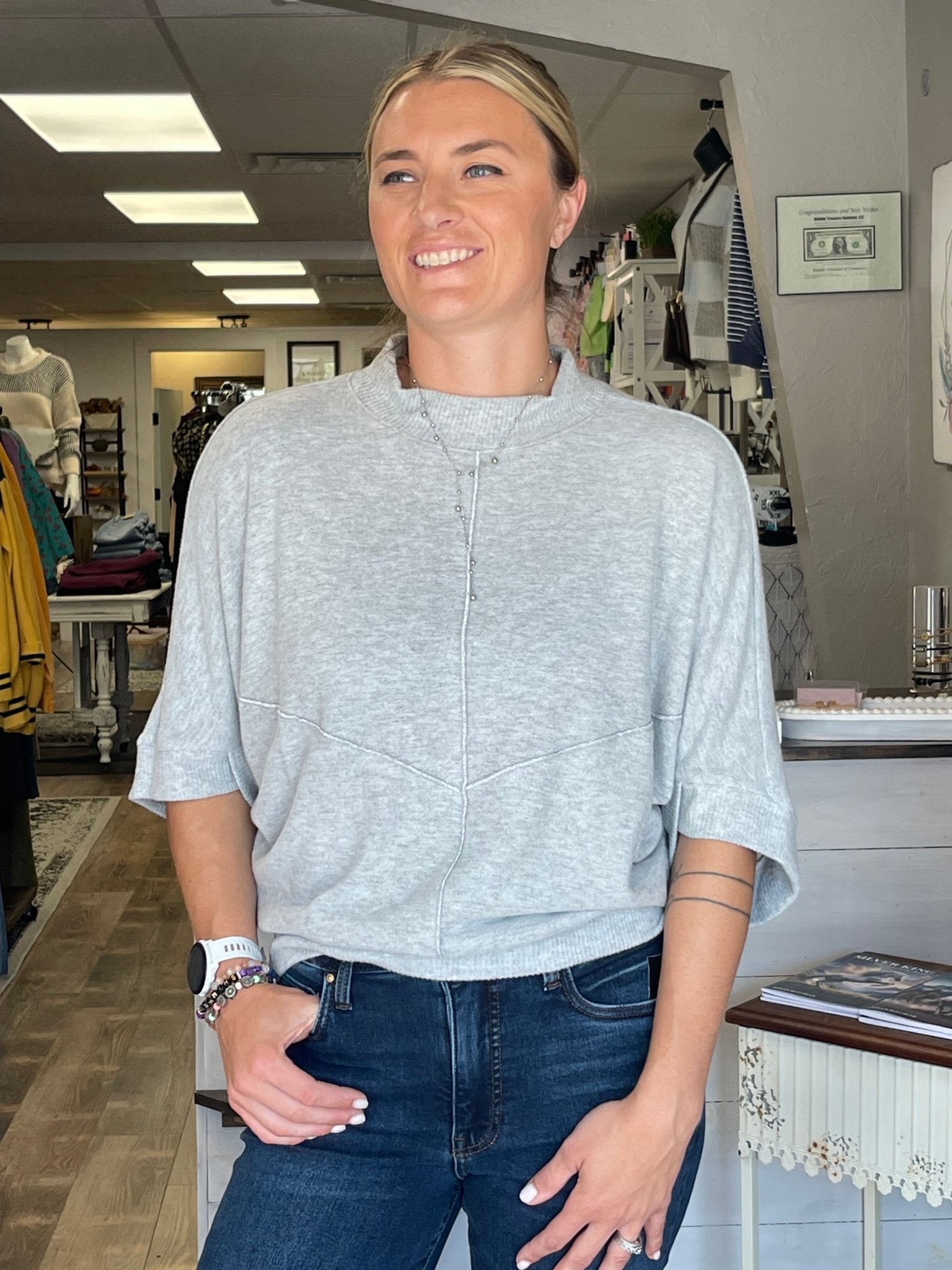 This heather gray Three Quarter Dolman Knit Top by Democracy features a relaxed fit and a banded hem for comfortable, polished wear. The subtle metallic seaming detail adds a touch of elegance, making it ideal for festive gatherings, professional environments, or everyday style. Its versatile design ensures effortless transition across occasions.