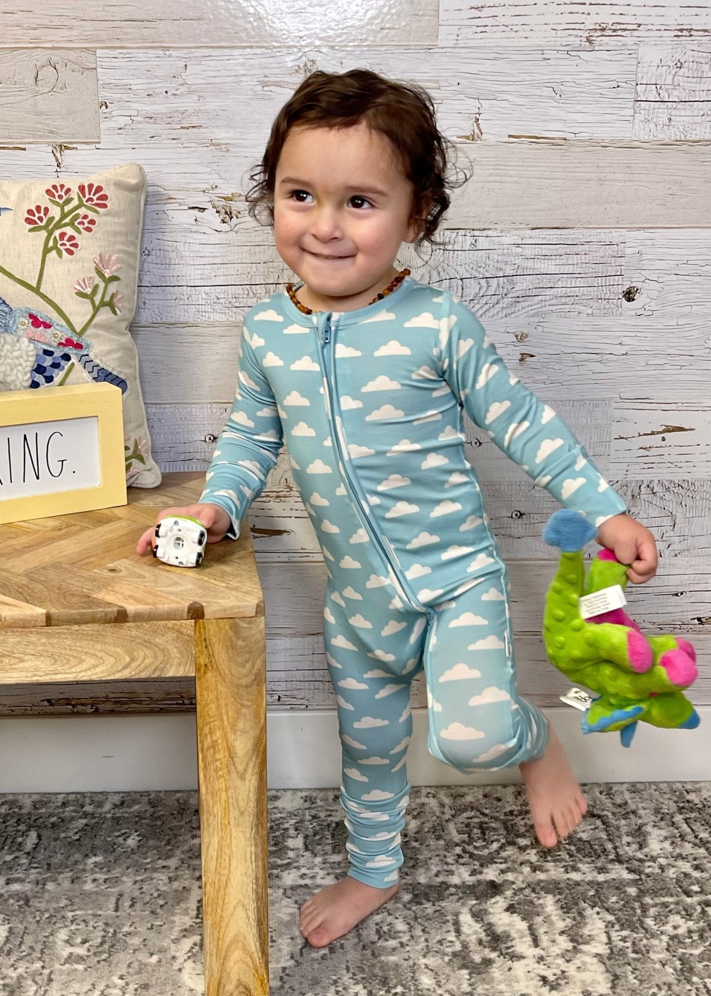 This zip one piece is super soft and comfortable. Featuring a zipper that runs from the top of the outfit to the ankle. Our favorite part about this outfit is that the zipper is 2 way! Making for super easy diaper changes without having to remove the whole outfit. The fabric the Gigi & Max used is super stretchy and breathable, made from bamboo viscose, wait until you feel how soft it is!