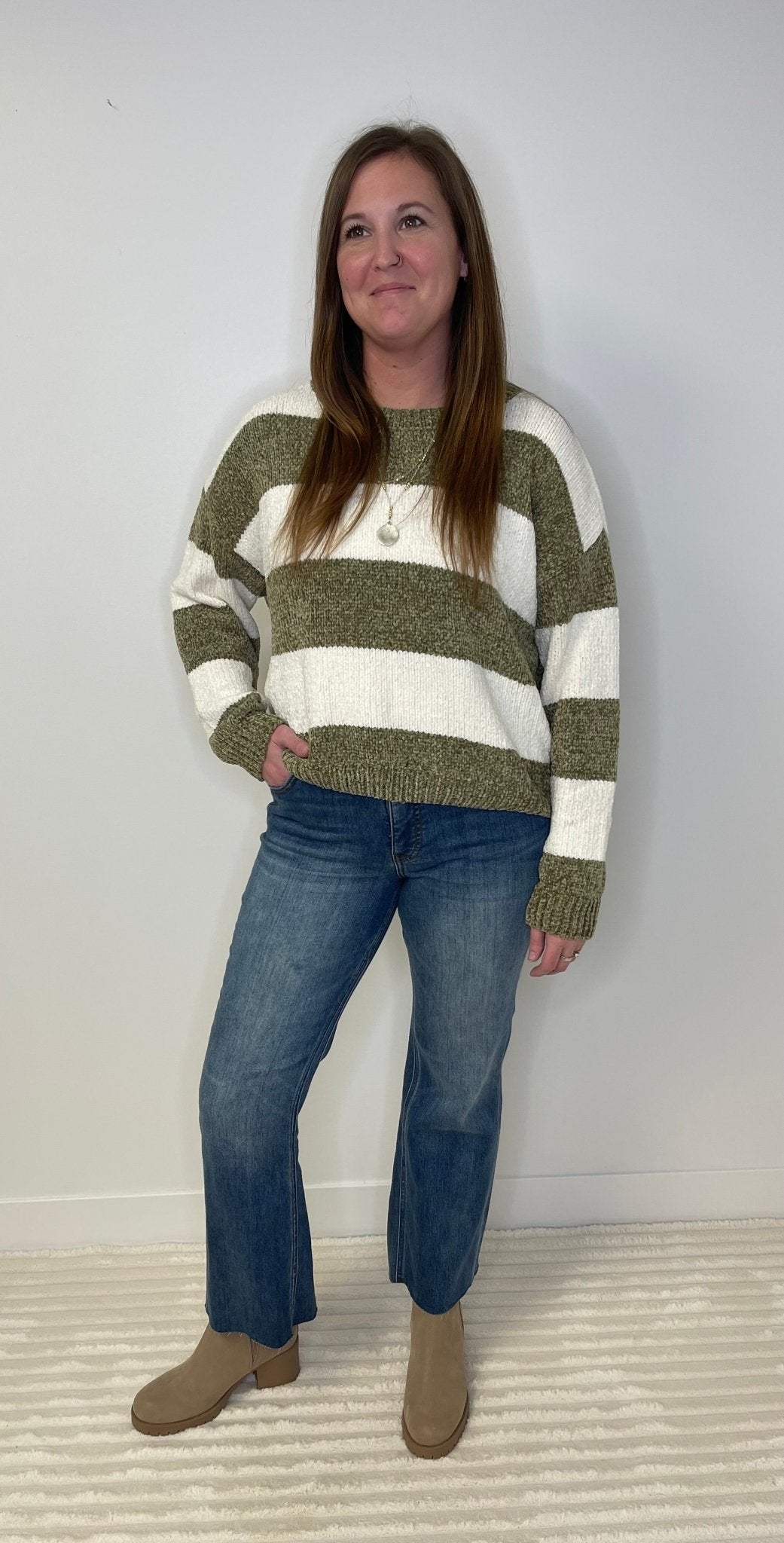 The Chenille Olive Stripe Sweater is super soft and will be a favorite go to for these cold winter months ahead.  Sweater weater is here and you will love this one!