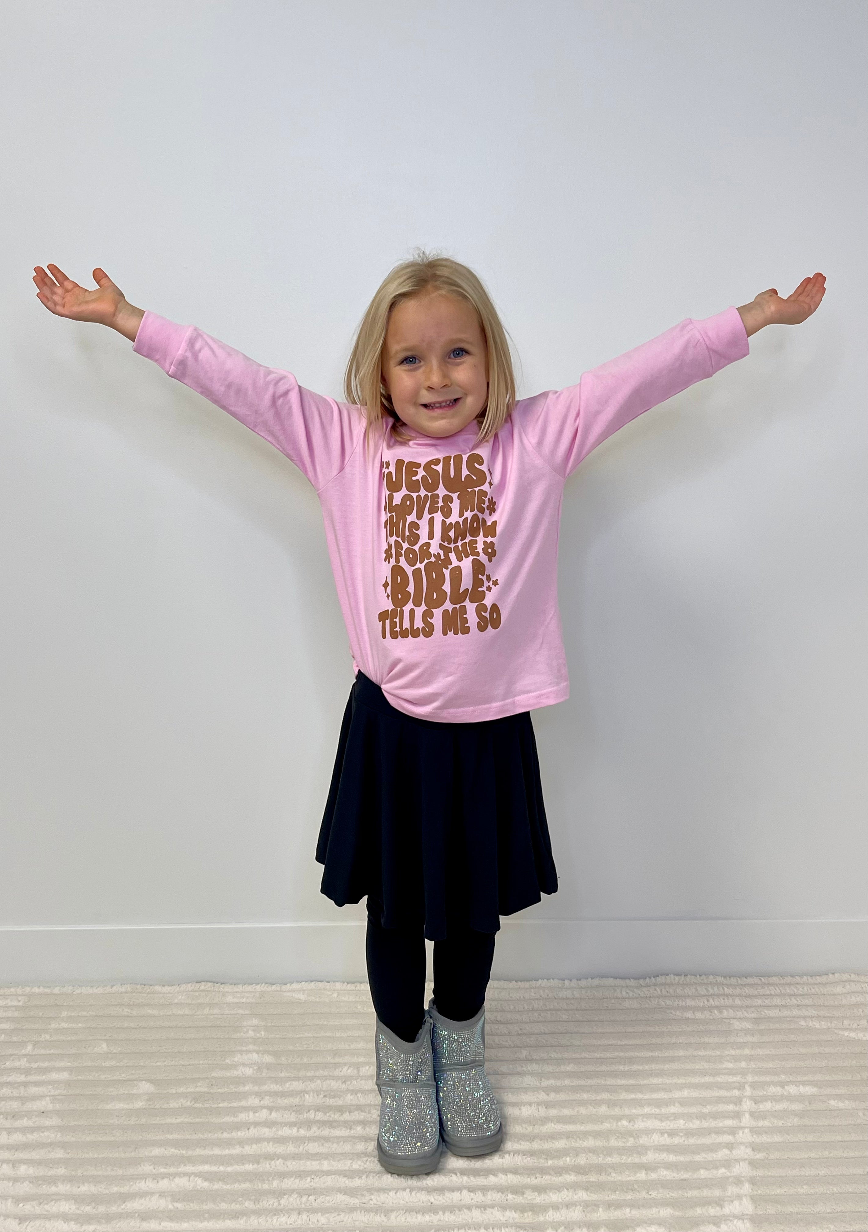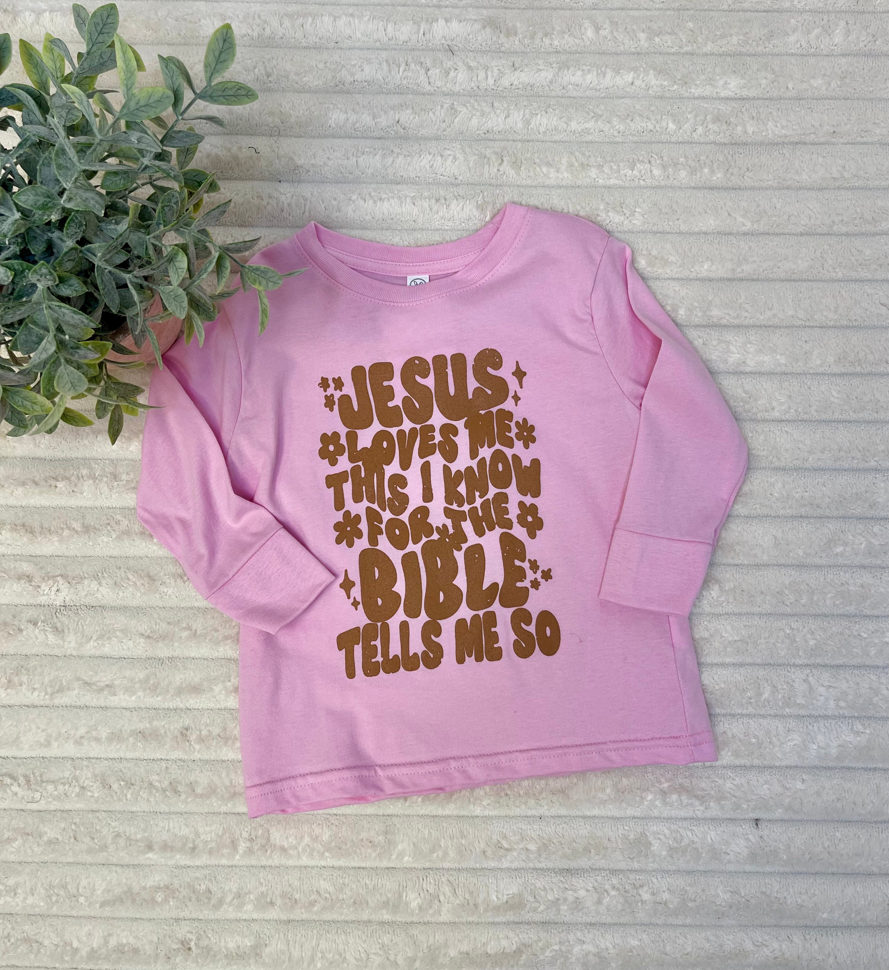 • Let the whole world know that Jesus loves you with this sweet long sleeve graphic tee for girls.