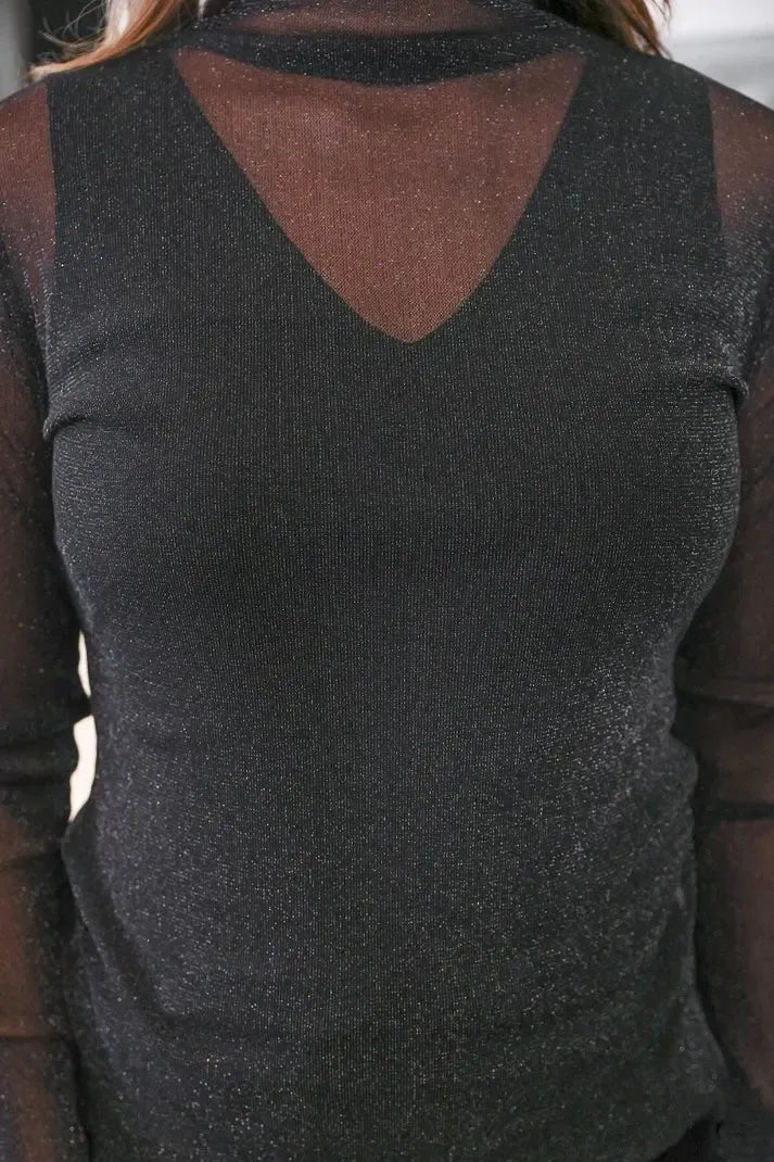 Get ready to be festive in the Keigan Mesh Top - Black Glitter!