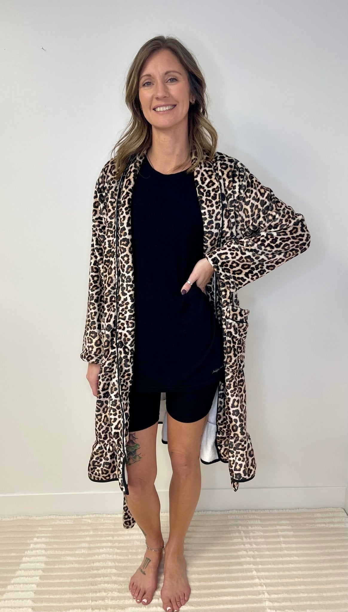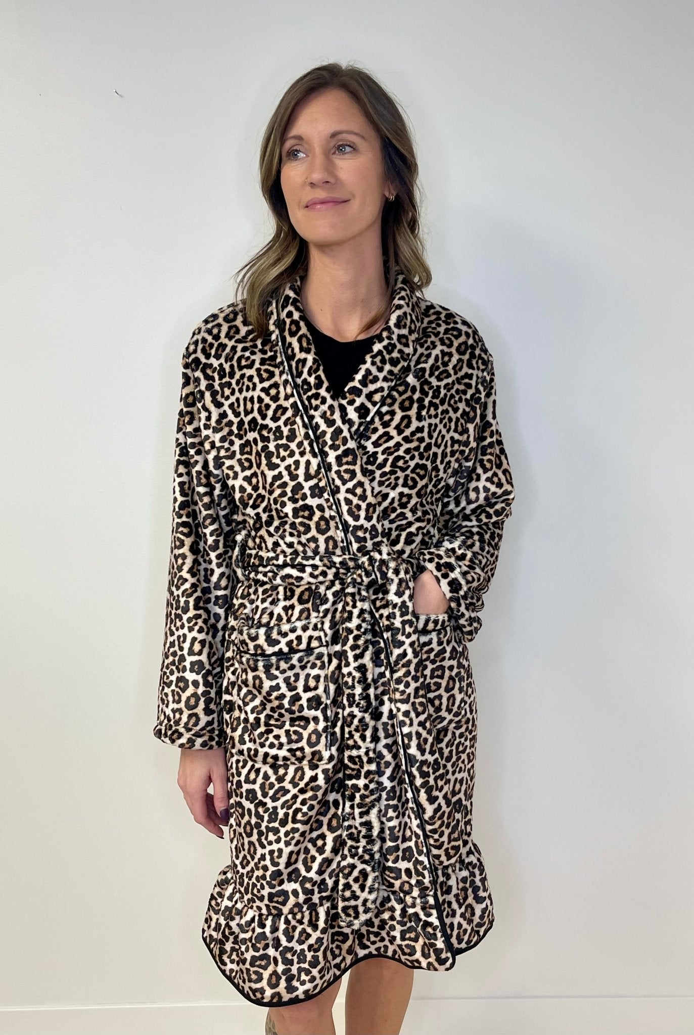 Slip into the Legacy Lounge Robe in the fun leopard print for a mix of style and comfort! With long sleeves for cozy coverage and a playful ruffle hem adding a flirty bounce, this feminine robe wraps you in effortless charm.