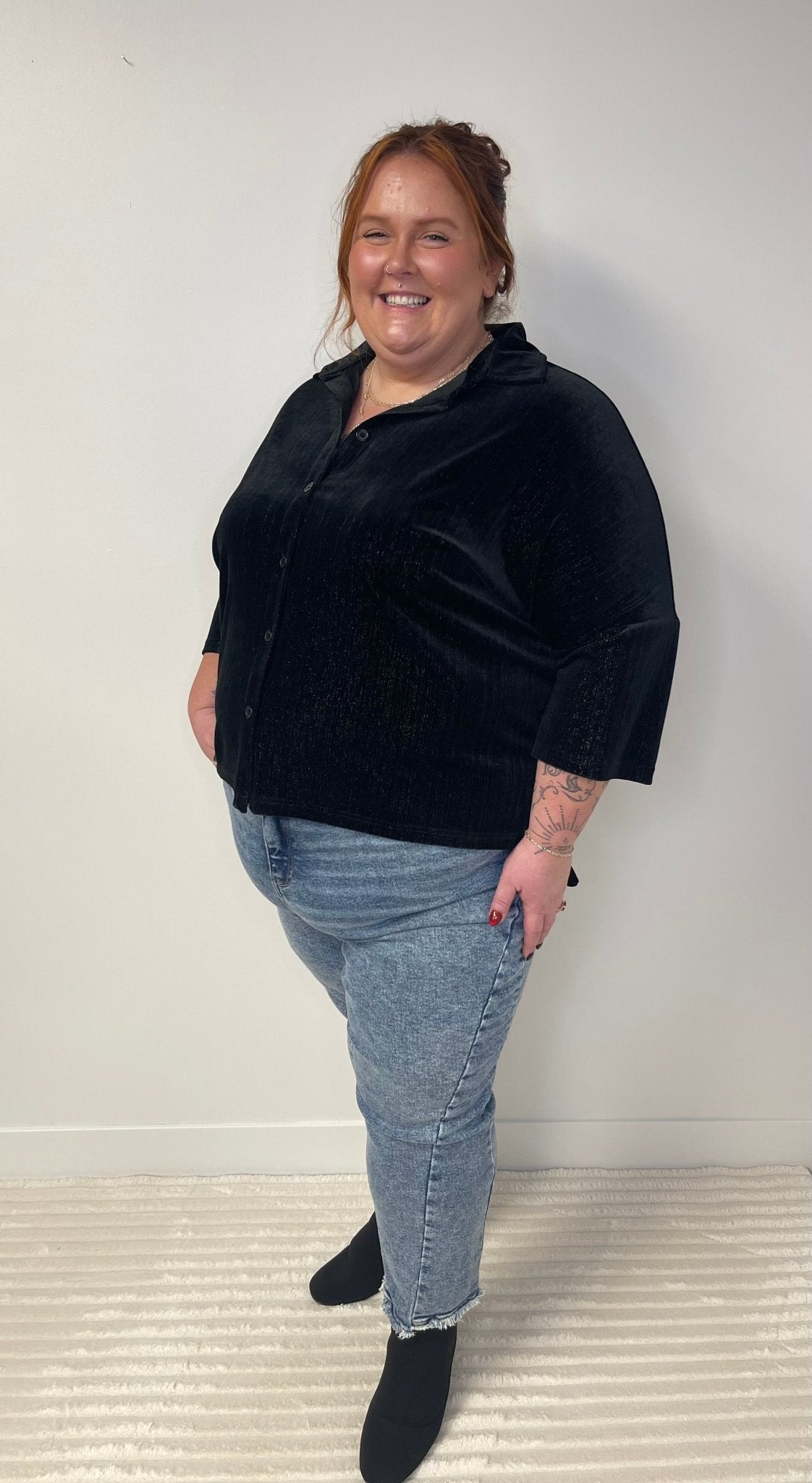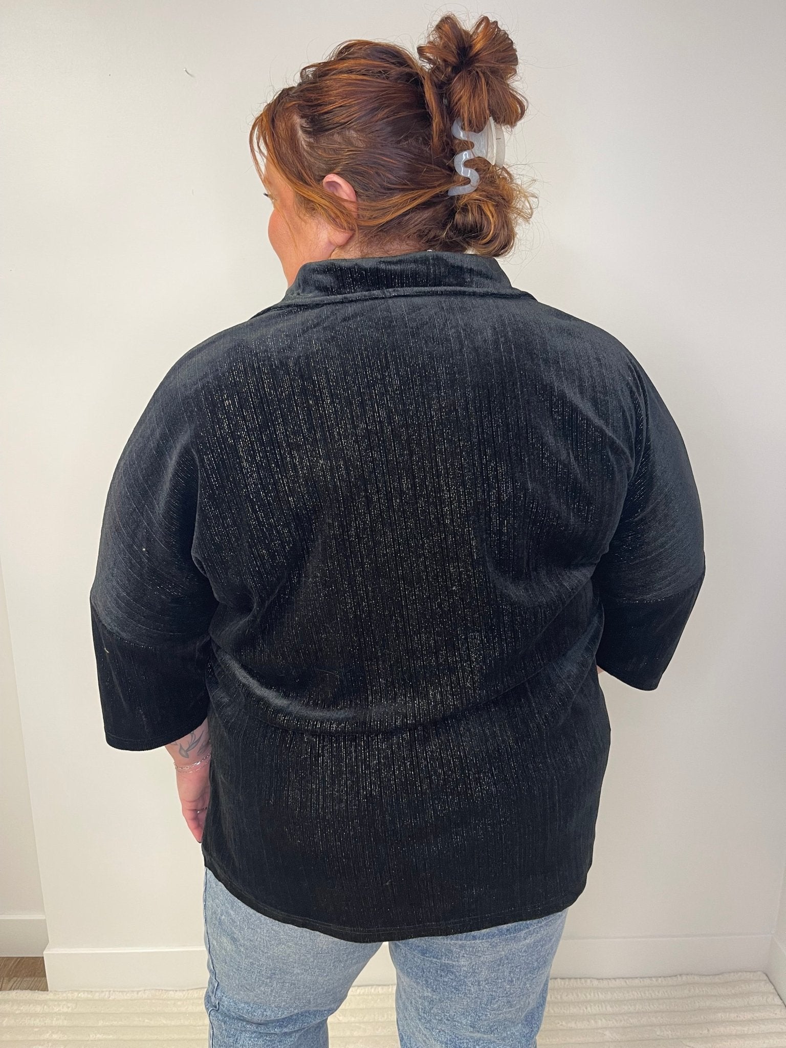 The Prim Button Up Velvet Top in Black offers a timeless and elegant look. Crafted from soft velvet with metallic woven throughout,  this stylish button-up is ideal for holiday gatherings or evening events.