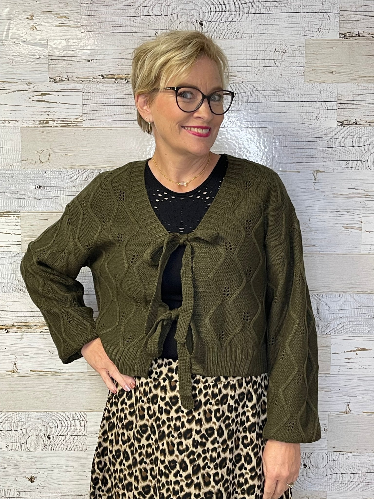 Elevate your wardrobe with the Knotted Crop Cardigan in a refreshing thyme leaf hue. Featuring a trendy tie-front and stylish balloon sleeves, this cropped piece adds a modern twist to any outfit. Pair it effortlessly with denim for casual cool or complement a leopard skirt to create an eye-catching, on-trend look. Perfect for layering, it combines comfort and fashion seamlessly.