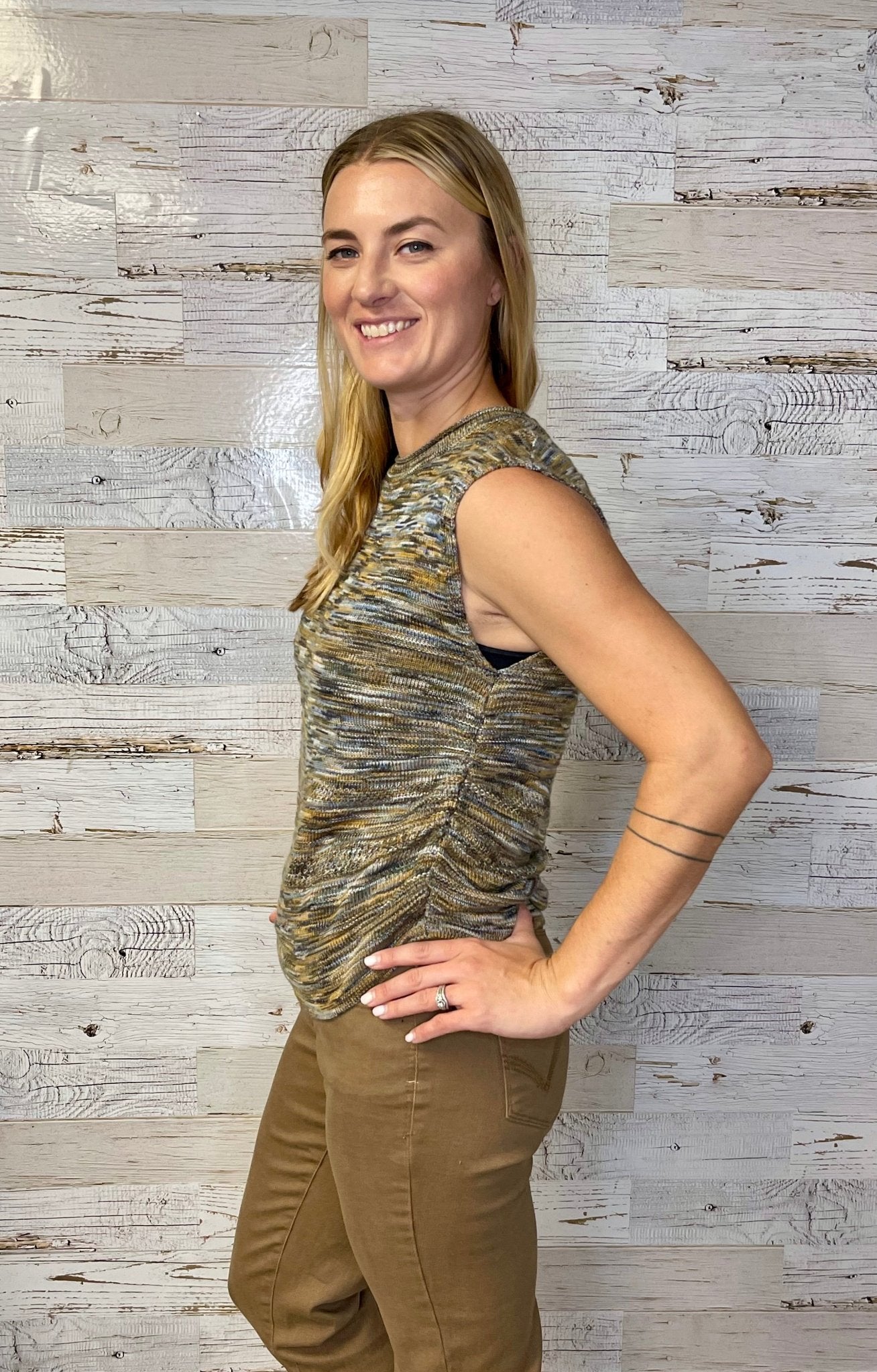 Elevate your wardrobe with the Golden Olive Sleeveless Sweater by Democracy, featuring elegant side ruching and a flattering round neck. Crafted from lightweight sweater knit, it offers comfortable layering under blazers or cardigans, making it a versatile piece for any season. Add a touch of sophistication and effortless style to your outfits with this must-have layering essential.