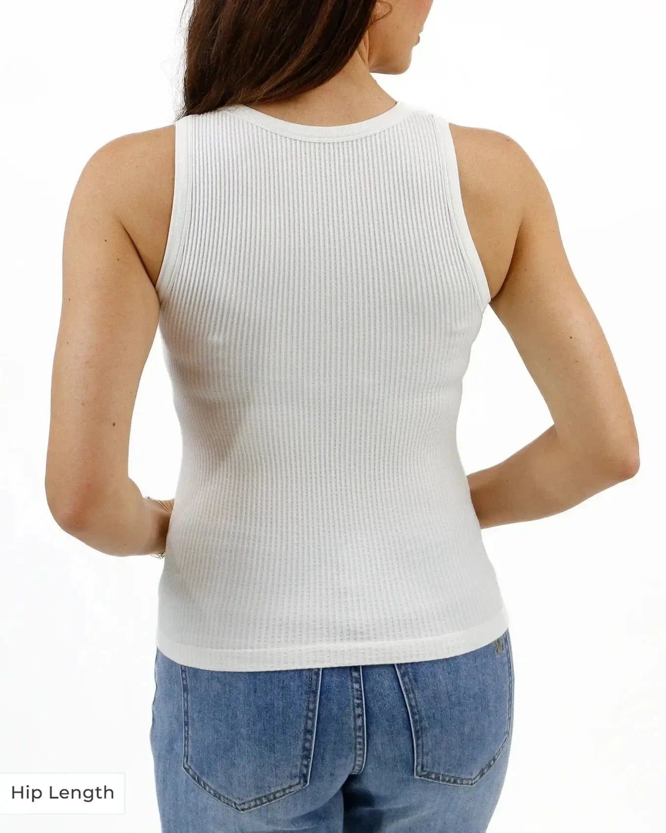 • This fitted tank is now available in waist or hip length for even more styling versatility! Style it on its own for a sunny day look or let it be your year-round layering staple.
