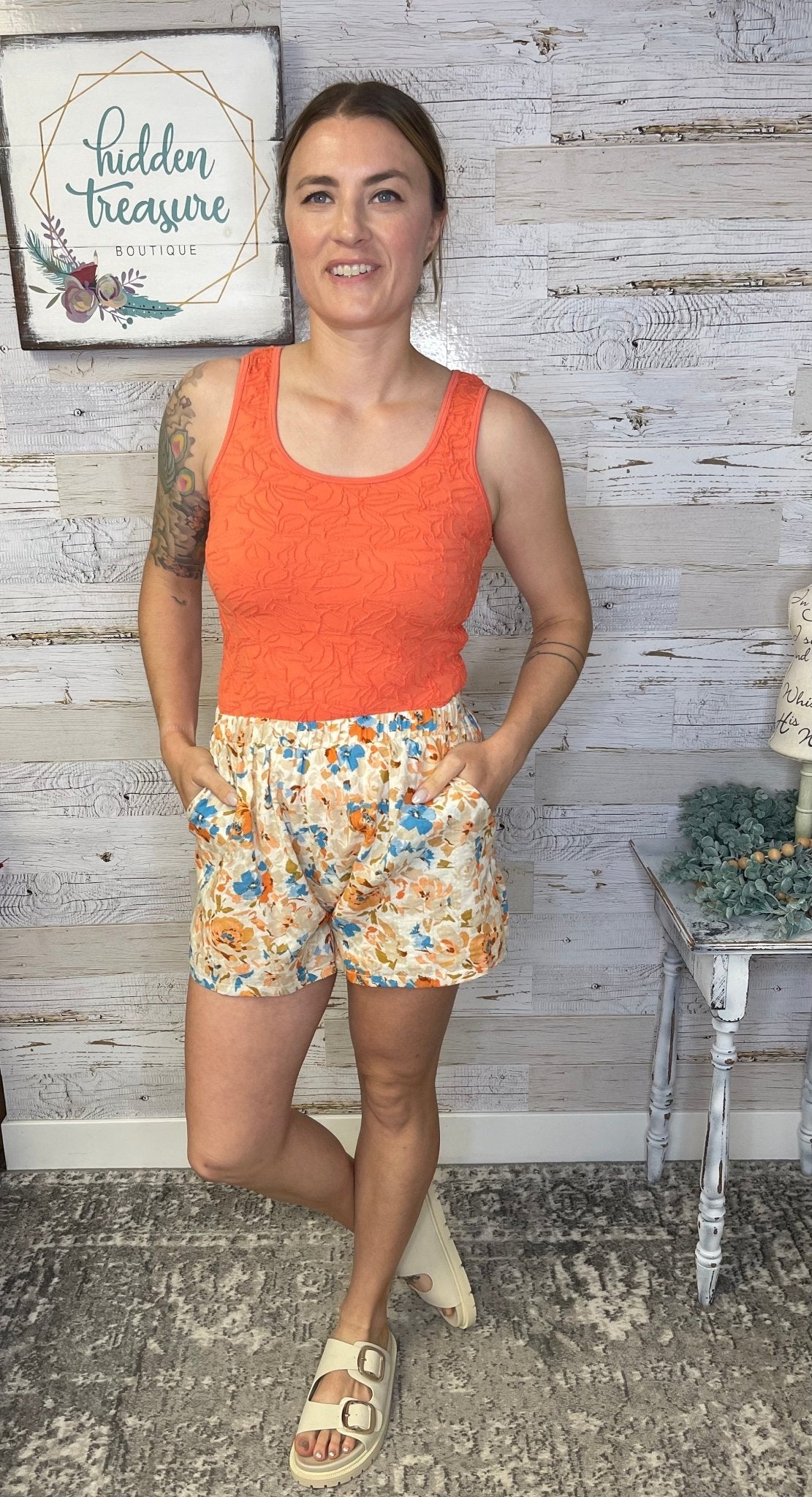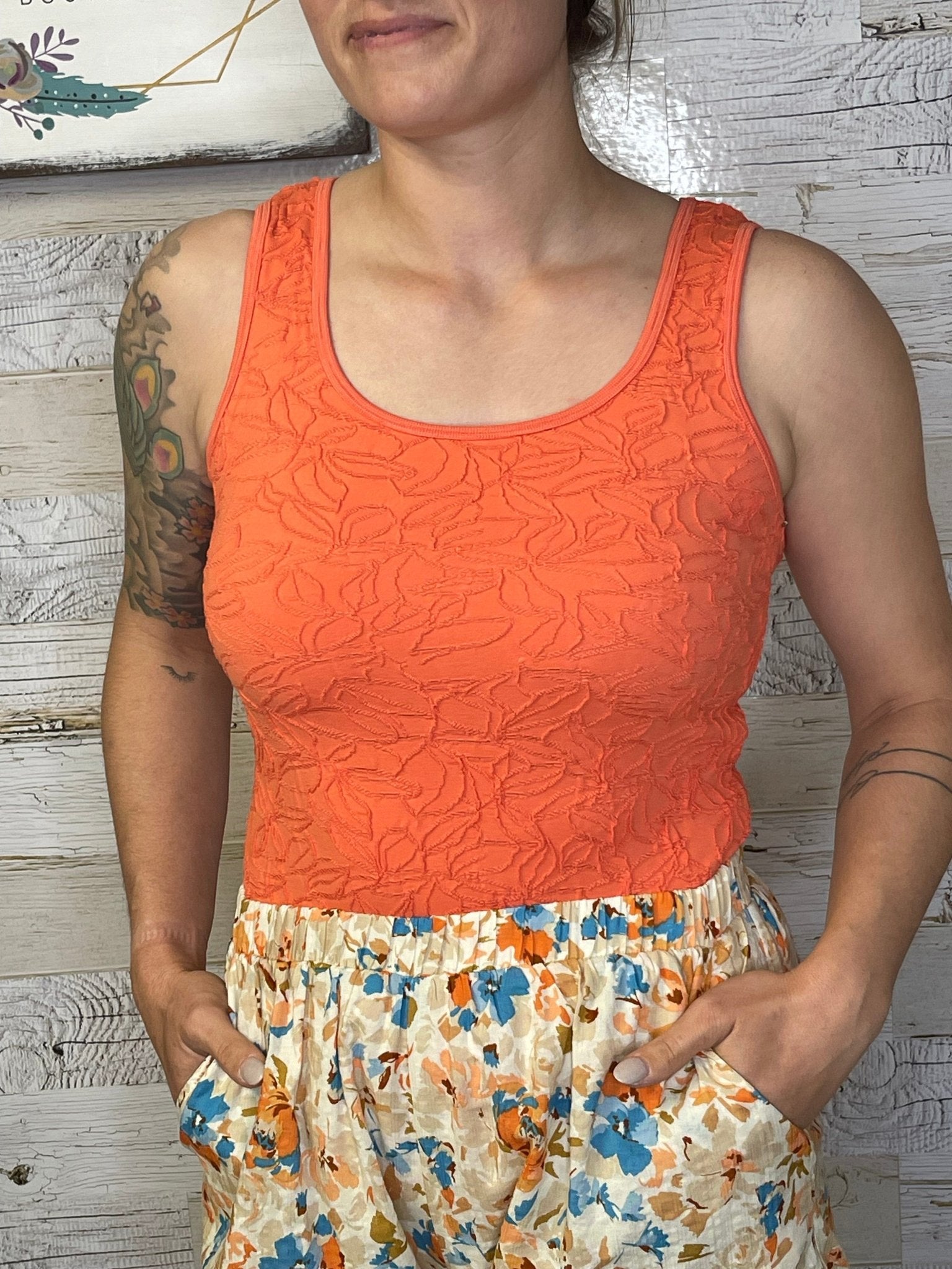 • Textured jacquard orange floral tank top with flattering scoop neckline