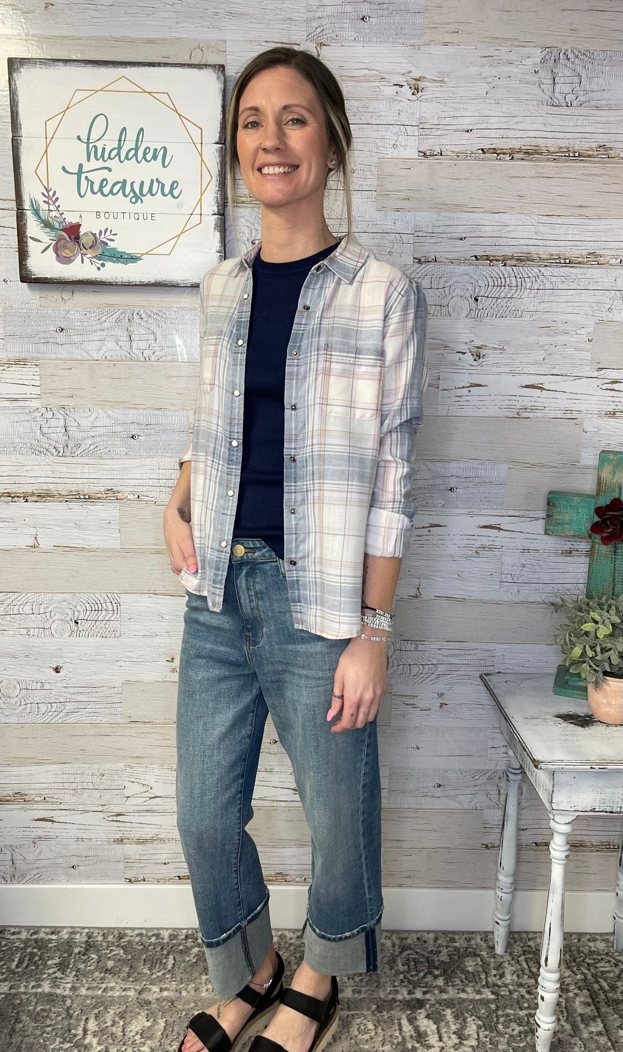 Experience the perfect blend of style and comfort with the Marina Double Pocket Top by Flag & Anthem. Made from high-quality woven fabric in a classic blue and pink plaid design, this top features pearl snap buttons for a touch of sophistication. Stay effortlessly fashionable with this must-have button-up top!