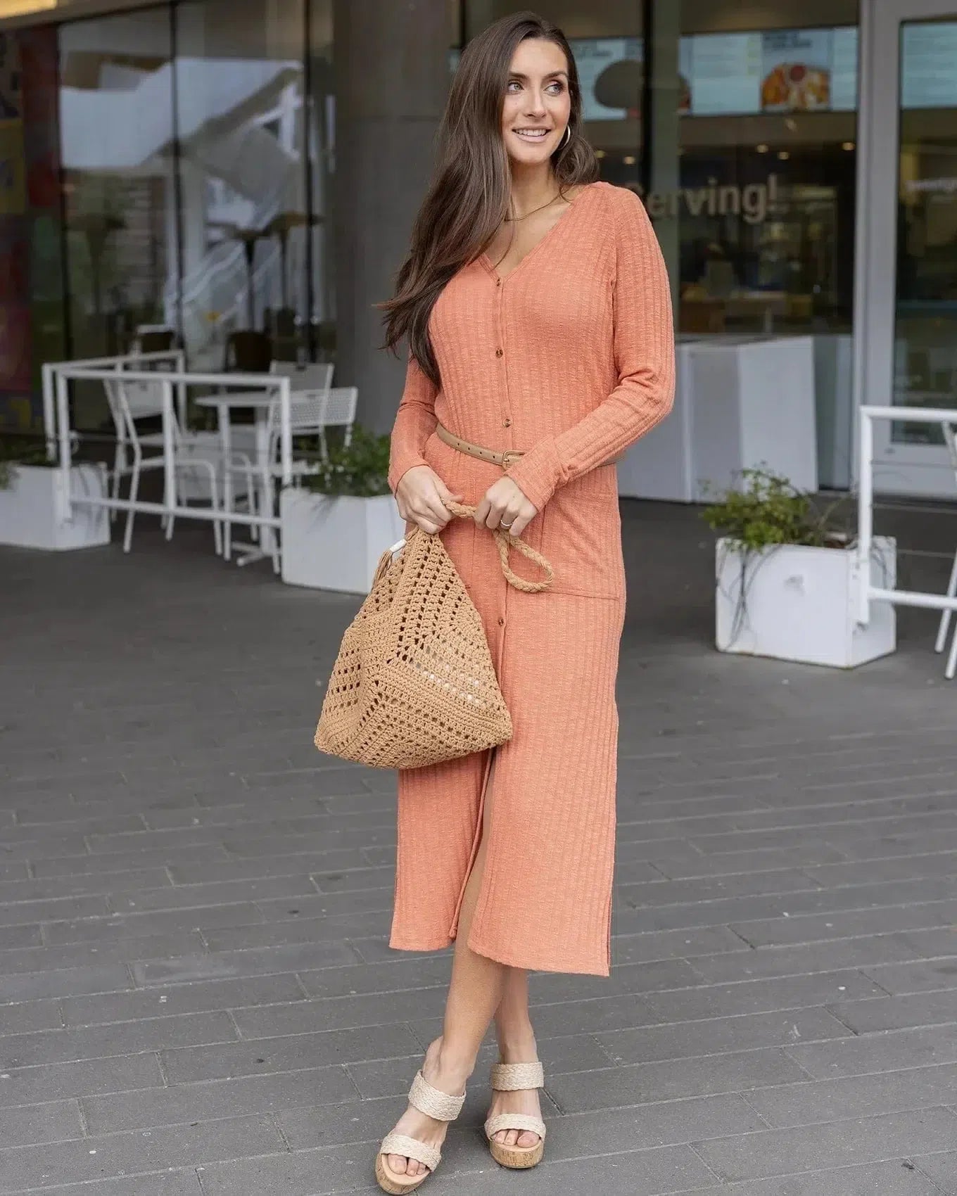 Dust up some drama in the best way with the all new Ribbed Long Duster Cardigan from Grace & Lace! This eye-catching long cardigan features a sleek, ribbed knit design in a gorgeous sunset orange hue that’s just right for welcoming in warmer temps. They created this versatile cardigan with your style needs in mind - designing it to be worn two different ways! Wear layered over long sleeve tops or bramis with jeans as a classic duster cardigan sweater, or fasten the functional buttons all the way up to style as a chic ribbed knit dress. Either way, you’ll love adding this sophisticated style to your spring wardrobe!