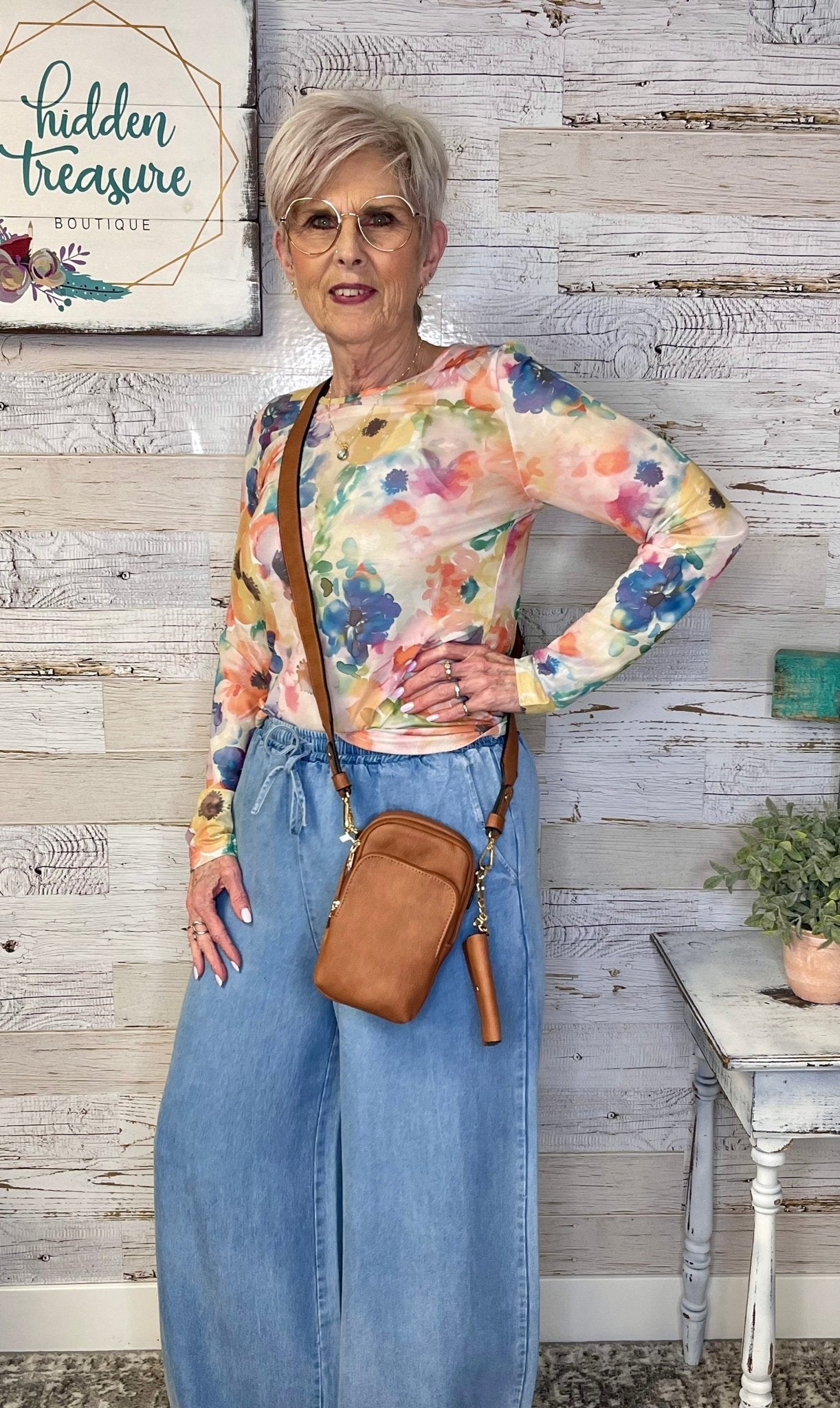 • Long sleeved, sheer mesh top in multicolored watercolor with flattering scoop neckline