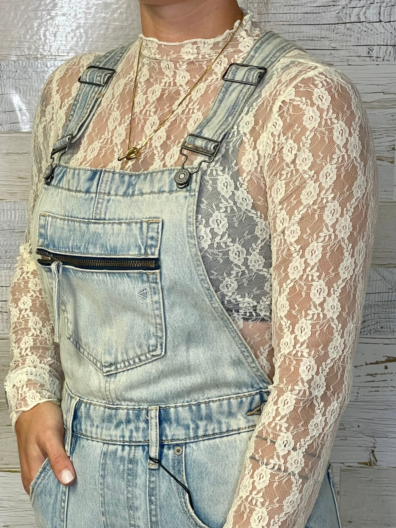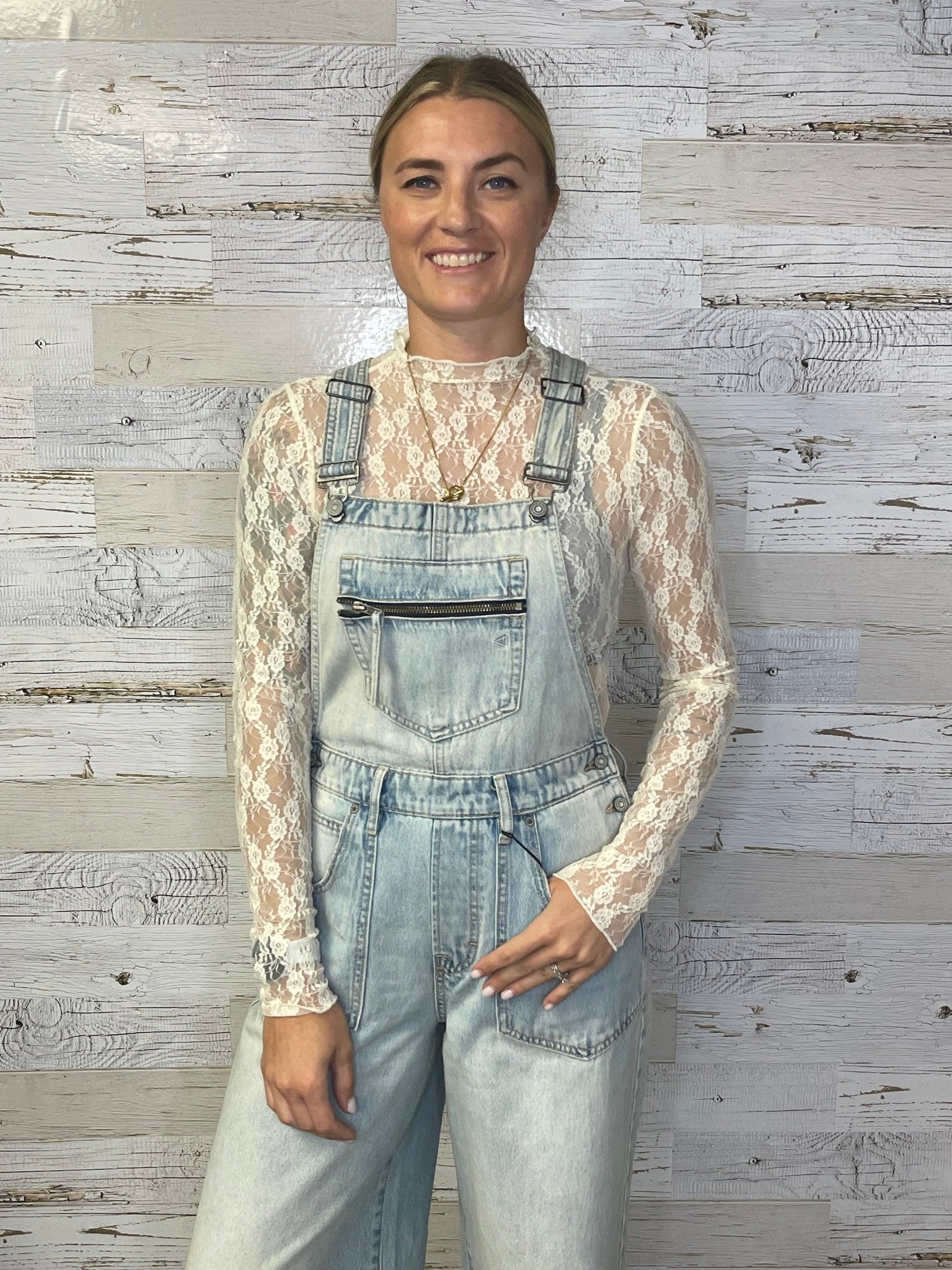 This Champagne Mesh Lace Top features a high neck and a fitted silhouette, crafted from sheer mesh lace for an elegant, delicate look. Perfect for layering, it adds a refined touch to any outfit while maintaining a sophisticated, modern edge.  We love it under sweater vests and even a great denim bib overall.