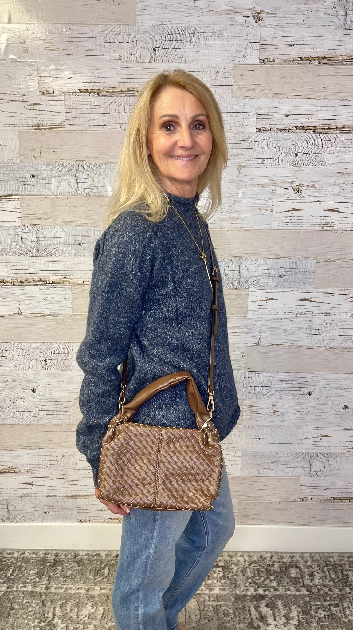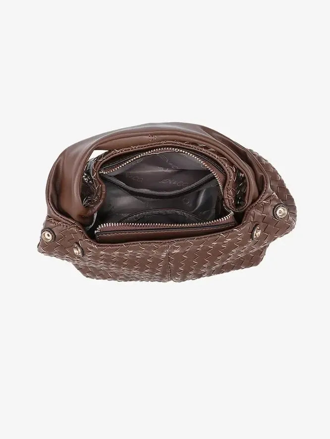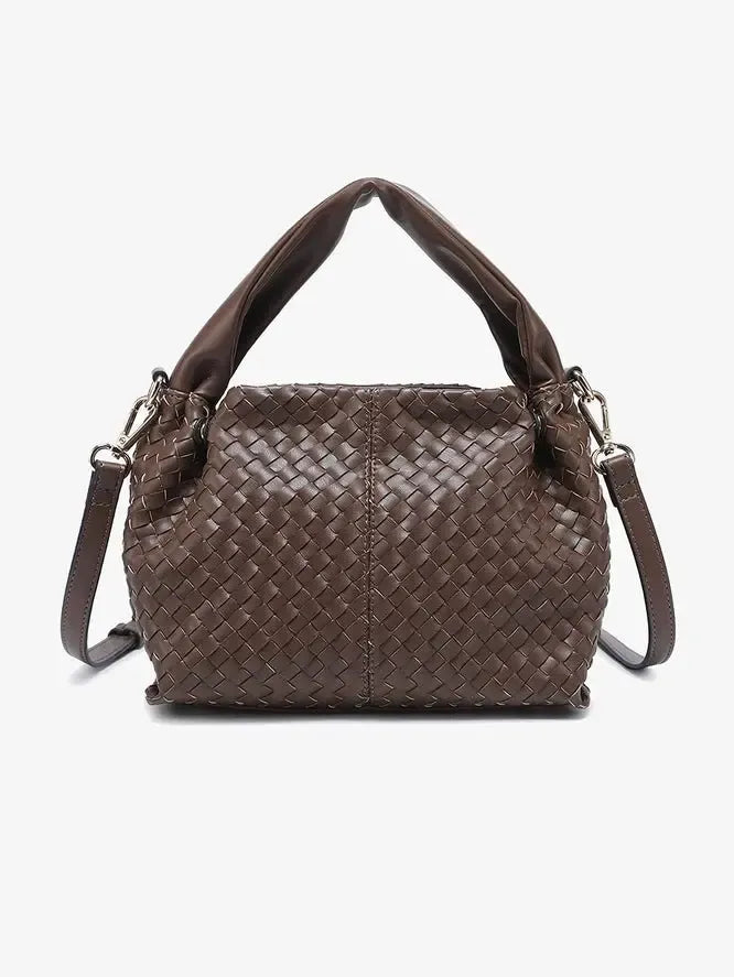 Crafted from woven vegan leather in a rich chocolate hue, the Charity Woven Crossbody combines elegance with versatility. Its structured top handle allows for graceful hand carry, while the adjustable and removable strap offers customizable wear. Secure your essentials effortlessly with the sleek zip closure, making this bag the perfect refined accessory for fall.