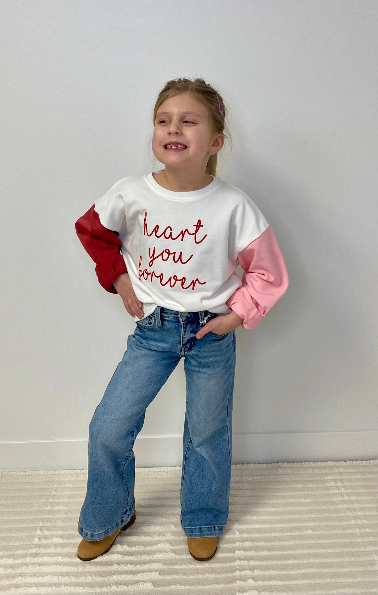 The Kids Colorblock Sweatshirt will brighten her wardrobe with a playful colorblock style —perfect for Valentine's Day or everyday adventures. Featuring bold, contrasting color panels in a fun design, this cozy piece brings joy to any outfit. Soft and comfortable for all-day wear, it's an instant favorite for girls who love vibrant style.