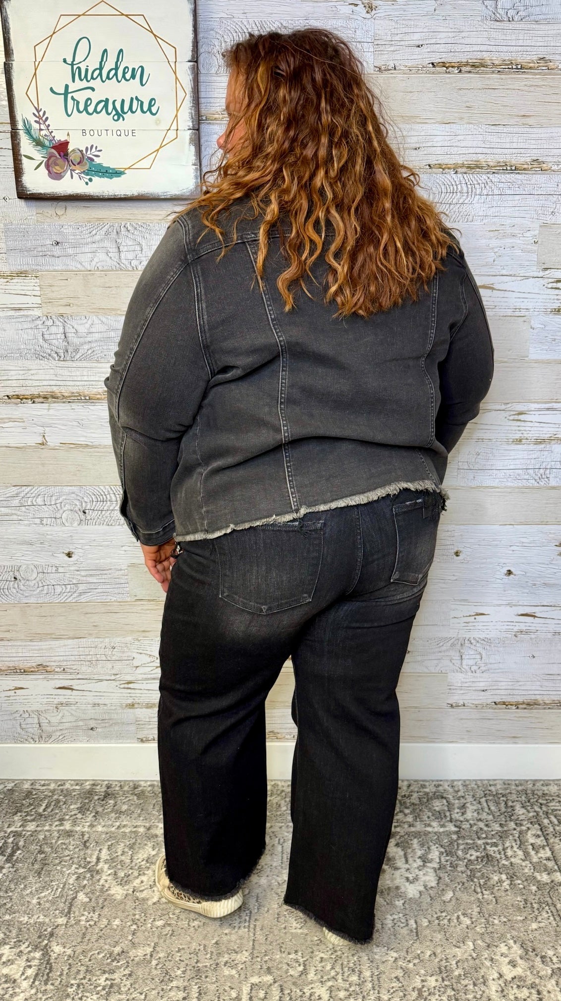 Elevate your style with our Raw Hem Frayed Black Jacket! Crafted from stretch denim, this faded black jacket offers both comfort and edginess. Perfect for completing any look, this jacket will make you stand out in any crowd. We love it paired with the black wide leg distressed denim and a great graphic tee.