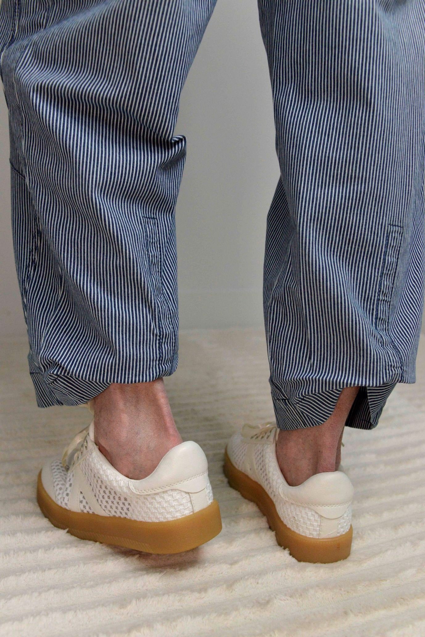 Relaxed comfort meets everyday style in these barrel jeans by Democracy. Designed with the Ab Solution waistband and slightly fitted at the hips, they transition to a looser, relaxed silhouette through the thighs for the on trend barrel style. Front dart panels provide a flattering fit for the tummy while maintaining that coveted laid-back aesthetic. The classic navy stripe adds versatile appeal to any wardrobe.  Great for all your summer looks!